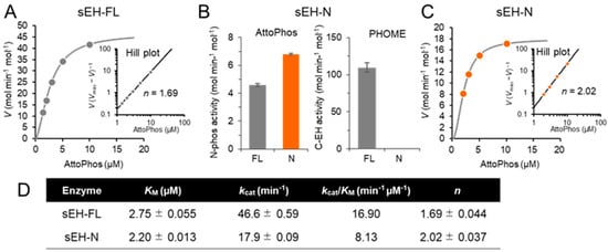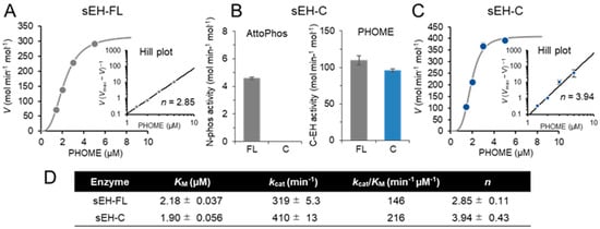 When N-phos activity was determined using sEH-FL and the Attophos substrate, a positive cooperativity with a Hill coefficient (n) of 1.69 ± 0.04 was observed from steady-state enzyme kinetic analysis (Figure 1A). To elucidate the mechanism of the allosteric effect, we prepared the truncated enzyme sEH-N, which had no detectable C-EH activity (Figure 1B) but showed a positive cooperativity similar to that found in sEH-FL (n = 2.02 ± 0.04) (Figure 1C,D). Similar positive cooperativity (2.85 ± 0.11) was observed when C-EH activity was determined using sEH-FL and the PHOME substrate (Figure 2A). Again, the single-domain enzyme sEH-C, which had C-EH activity alone (Figure 2B), exhibited a positive cooperativity (n = 3.94 ± 0.43) (Figure 2C,D). Thus, both the N-phos and C-EH activities are regulated via intradomain allostericity via their respective substrates.