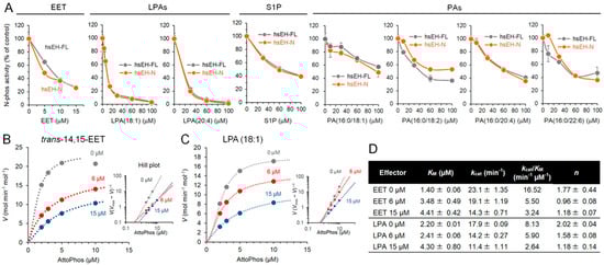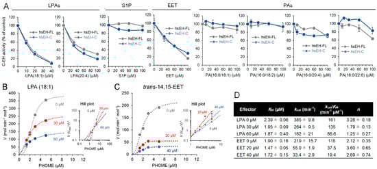 Next, we examined the effect of EET, LPAs, S1P, and PAs on the C-EH activity using sEH-FL and sEH-C. Similar to the results shown in Figure 3, hydrolysis of PHOME by sEH and sEH-C was inhibited by EET, LPAs, and S1P to the same extent, whereas PAs affected the activity minimally (Figure 4A). Kinetics analysis of LPA (18:1) action on sEH-C showed a dose-dependent reduction in the kcat, from 385 ± 10 to 162 ± 21 min−1, and in the Hill coefficient, from 3.26 ± 0.18 to 1.25 ± 0.27 in the presence of 60 μM LPA (18:1), suggesting an intradomain allosteric mechanism in the decrease in the degree of positive cooperativity in sEH-C (Figure 4B,D). Similarly, 14,15-EET decreased the kcat from 219 ± 16 to 55.0 ± 1.9 and 33.4 ± 2.9 min−1 at 20 and 40 μM, respectively (Figure 4C,D). Thus, like the interpretation of the results of the sEH-N regulation by LPA described in Section 2.2, this result suggests an allosteric mechanism but not a simple competitive one in the 14,15-EET-mediated inhibition of sEH-C. On the other hand, 14,15-EET did not result in a decrease in the Hill coefficient, suggesting minimal impact on positive cooperativity (Figure 4C,D).