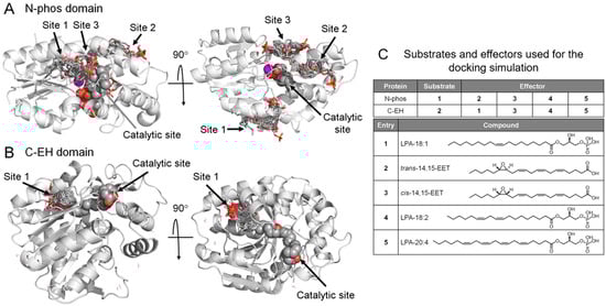 To assess the presence of a potential allosteric site that allows the binding of LPA and EET in each domain of sEH, we performed a docking analysis based on the known crystal structures of inhibitor-bound sEH. First, possible poses of the N-phos monomer and C-EH monomer were prepared from the available data [,], and the N-phos monomer/LPA (18:1) complex and the C-EH monomer/trans-14,15-EET complex, which can explain the catalytic mechanism, were predicted by the site docking analysis. The potential allosteric site for the test compound was predicted by blind docking analysis. As a result, three sites were predicted on the N-terminal domain (two of which, sites 2 and 3, are adjacent and may be occupied simultaneously by the ligand) (Figure 5A) and one on the C-EH (Figure 5B) as candidate sites for binding to LPA and EET (structure shown in Figure 5C).