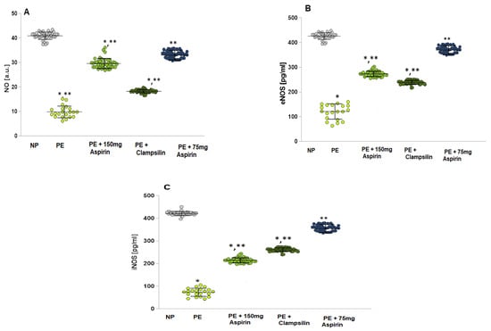Present the NO levels, eNOS, and iNOS in serum samples. (A) NO: Normotensive pregnancy (NP); PE patients; PE + 150 mg/day Aspirin; PE + Clampsilin; PE + Aspirin 75 mg/day. (B) eNOS: NP; PE patients; PE + 150 mg/day Aspirin; PE + Clampsilin; PE + Aspirin 75 mg/day. (C) iNOS: NP; PE patients; PE + 150 mg/day Aspirin; PE + Clampsilin; PE + Aspirin 75 mg/day. LSD post hoc test; * p < 0.05 vs. NP group; ** p < 0.05 vs. PE group.