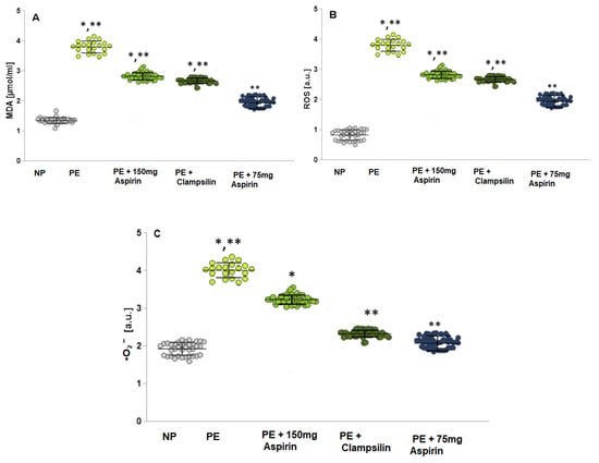 The levels of oxidative stress markers are presented as MDA, ROS production, and •O2−. (A) MDA levels -NP; PE; PE + Aspirin 150mg/day; PE + Clampsilin; PE + Aspirin 75 mg/day. (B) ROS production— NP; PE; PE + Aspirin 150mg/day; PE + Clampsilin; PE + Aspirin 75 mg/day. (C) NP; PE; PE + Aspirin 150 mg/day; PE + Clampsilin; PE + Aspirin 75 mg/day. LSD post hoc test; * p < 0.05 vs. NP group; ** p < 0.05 vs. PE group.