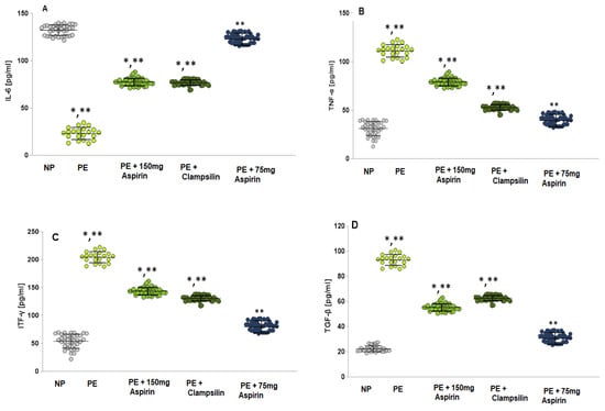 In the PE group, the interleukin 6 (IL-6) levels (Figure 3A) were statistically significantly increased both compared to NP (LSD post hoc test, p < 0.05) and compared to groups with therapy—Aspirin 150 mg/day (LSD post hoc test, p < 0.05) and Clampsilin (LSD post hoc test, p < 0.05). In the group with the therapy of Aspirin 75 mg/day (LSD post hoc test, p < 0.05), the results were close to the NP (LSD post hoc test, p = 0.1).