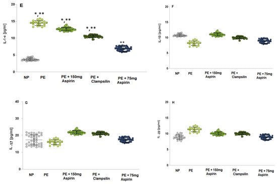 Transforming growth factor-β (TGF-β; Figure 3D) also showed a statistically significant increase in the PE group compared to NP (p < 0.05) and against groups with therapy: Aspirin 150 mg/day p < 0.05 and Clampsilin (p < 0.05). Interleukin 1α (IL-1α; Figure 3E) level in the PE women was statistically significantly higher compared to NP (LSD post hoc test, p < 0.05) and groups with therapy (Aspirin 150 mg/day (p < 0.05) and Clampsilin (p < 0.05)). Interleukin 1β (IL-1β; Figure 3F), Interleukin 17β (IL-17; Figure 3G) and Interleukin 22 (IL-22, Figure 3H) were not shown statistically difference between the PE group and NP and therapy groups.