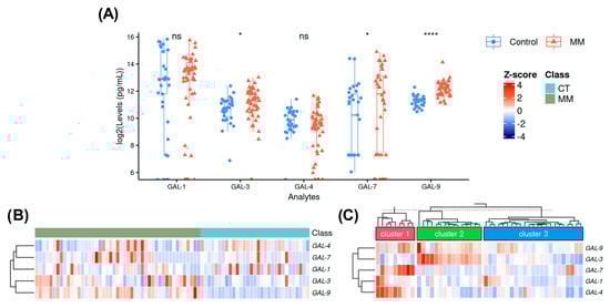 Evaluation of the plasmatic levels of galectins by boxplot (A) and heatmap (B) and (C) analyses. The (B) heatmap englobes the MM and healthy control patients. While the (C) heatmap represent the clusterization of MM according to their z-score values distribution. p-values of t-test are represented as follows: ns (not significant), p > 0.05; p ≤ 0.05 (*); and p ≤ 0.0001 (****).