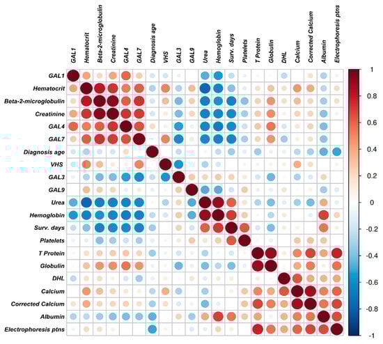 The correlation analysis between serum galectin levels and biochemical parameters revealed a moderate to strong positive correlation cluster, showing statistical significance, involving Gal-1, Gal-4, Gal-7, hematocrit, creatinine, and β2-microglobulin (Figure 2; Supplementary Tables S4 and S5). A separate negative correlation cluster was observed, including urea, hemoglobin, survival days, and Gal-3. In contrast, Gal-9 did not exhibit any notable correlations. Scatter plots displaying individual correlations between galectins and key clinical variables associated with MM progression are presented in Supplementary Figure S1.