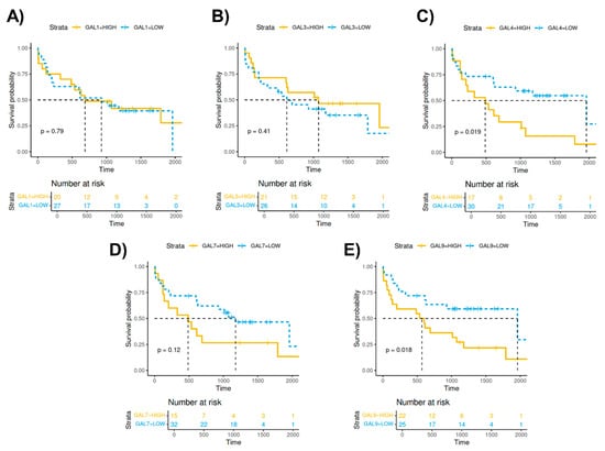 Overall survival analysis considering the high and low levels of galectins 1 (A), 3 (B), 4 (C), 7 (D), and 9 (E) and the survival days from MM patients.