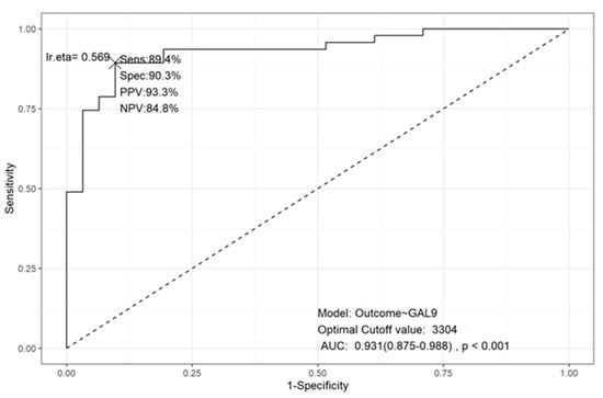 To validate serum galectin levels as potential biomarkers for distinguishing MM patients from healthy individuals, we applied a Generalized Linear Model (GLM). The area under the curve (AUC) analysis demonstrated statistically significant values for sensitivity and specificity. Among the galectins tested, only Gal-9 achieved strong performance metrics, including favorable AUC and accuracy values (Figure 4), while the others showed less promising results (Supplementary Figure S2). The cutoff value for Gal-9 to distinguish between MM patients and healthy individuals was 3304 pg/mL, with a sensitivity of 89.4%, specificity of 90.3%, positive predictive value (PPV) of 93.3%, negative predictive value (NPV) of 84.8%, and an AUC of 0.931 (95% CI: 0.875–0.988), p < 0.001. These findings are particularly noteworthy, as Gal-9 showed both the highest plasma levels in patients and the strongest association with reduced survival probability (Figure 4).