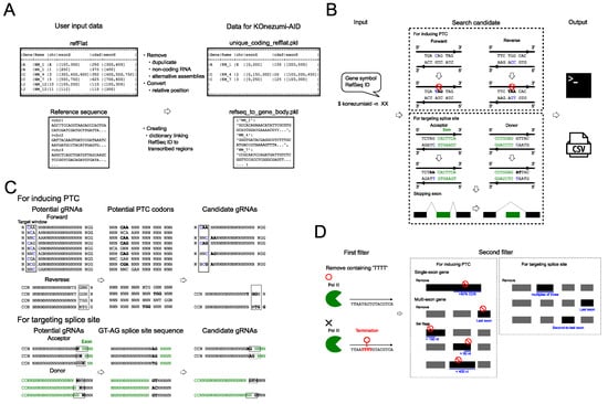 After preprocessing, KOnezumi-AID accepts a gene symbol or RefSeq ID as input from the user and identifies the optimal gRNA candidates for knocking out the target gene. The gRNA design strategy of KOnezumi-AID focuses on inducing a PTC or causing a frameshift mutation by disrupting the splice acceptor or donor consensus nucleotides [11,12,13,14]. Experiment-ready gRNAs are printed to the standard output and saved as comma-separated value (CSV) files in the directory konezumiaid_data/output (Figure 1B).