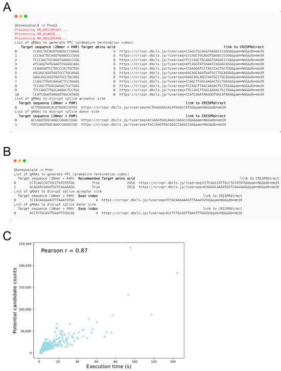 The output of KOnezumi-AID includes the gRNA sequence with the PAM, the link to CRISPRdirect [26], and targeted amino acids for gRNAs designed to induce PTCs. Links to CRISPRdirect help users to efficiently select gRNAs with a minimal number of potential off-target sites. If a gene has multiple isoforms, gRNAs targeting all isoforms are included in the output (Figure 2A). For input genes with a single transcript or those specified by the RefSeq ID, the amino acid number of the target site is shown. Additionally, for multi-exon genes, the ‘Recommended’ column is included, marked as True when all four criteria for NMD susceptibility are met, indicating a high likelihood of NMD. For gRNAs inducing exon skipping by disrupting the splice sites, the position of the targeted exon is shown (Figure 2B). The execution time of KOnezumi-AID was less than 2 s for 18,536 (89.4%) mouse genes. Only 113 genes required more than 10 s, with the longest processing time being 144 s. The Pearson correlation between the execution time and the total number of sequences containing “C” within the target window was 0.87, indicating that the processing time for each gene is dependent on the number of such sequences (Figure 2C).