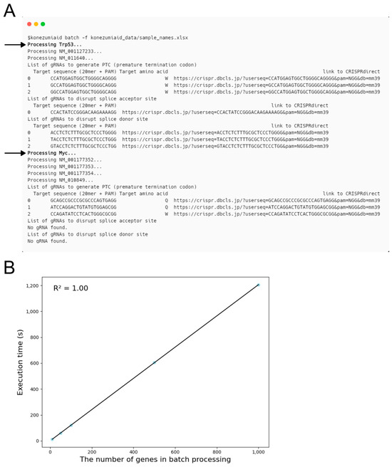 Batch processing. (A) Output of KOnezumi-AID for batch processing. The results of batch searches using an Excel file containing the gene abbreviations, Trp53 and Myc, are shown. Two genes being searched sequentially are indicated in bold by arrows. (B) Scatter plot illustrates the relationship between the number of genes in batch processing and execution time (in seconds). Light blue dots represent the average execution time for each batch processing epoch, while black line shows the linear regression line. The coefficient of determination (R2) is 1.