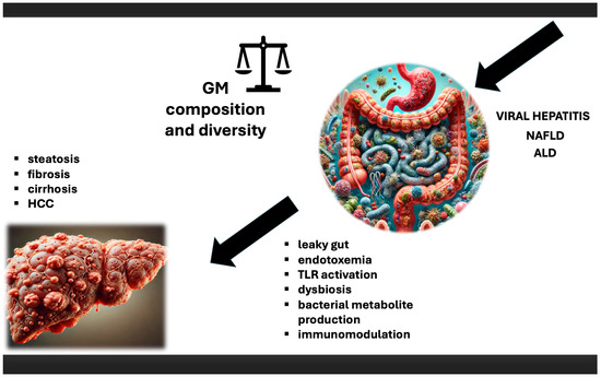 The role of microbiota in HCC. Impact of viral hepatitis, NAFLD, and ALD on microbiota, and subsequent consequences, which lead to chronic liver disease, with HCC development as a final stage. ALD—alcoholic liver disease; GM—gut microbiota; HCC—hepatocellular carcinoma; NAFLD—nonalcoholic fatty liver disease; TLR—Toll-like receptor.