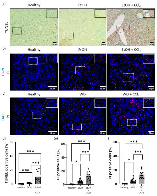 Fluorescence PI staining in liver mouse cryosections is comparable to the TUNEL assay. (a,d) Representative images from immunohistochemical TUNEL assay staining in paraffin-embedded liver sections from healthy, ethanol- (EtOH), and EtOH + CCl4-treated mice (n = 9) and their respective quantification analysis of TUNEL-positive cells (%). (b,e) Fluorescence staining of PI (red) and DAPI (blue) in liver cryosections of healthy, EtOH-, and EtOH + CCl4-treated mice (n = 9) and their respective morphometric analysis (%). (c,f) Representative fluorescence images of PI (red) and DAPI (blue) staining in liver cryosections of healthy, western diet- (WD), and WD + CCl4-treated mice (n = 9) and their quantification of PI positive cells (%). All images were taken at 20× magnification, scale bar = 50 μm. Results are expressed as mean ± SEM; * p < 0.05; *** p < 0.001.