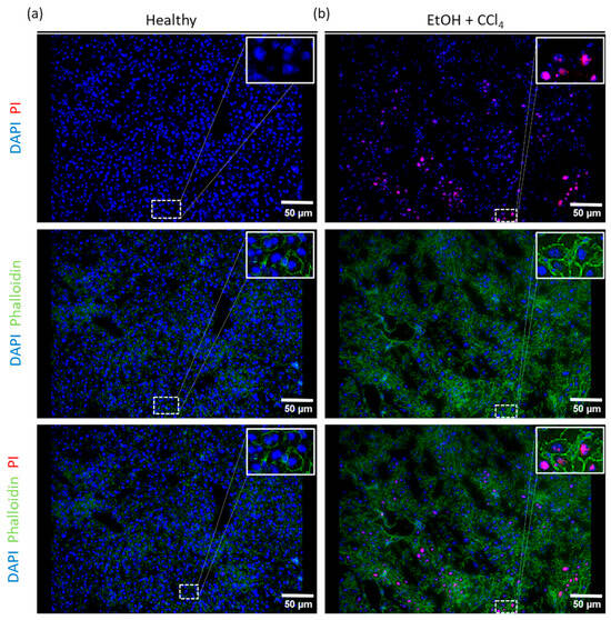 Fluorescence-labeled phalloidin co-stained with PI. (a) Representative fluorescence images from healthy liver mouse cryosections stained with PI (red), DAPI (blue), and phalloidin labeled with Alexa 488 (green). (b) Representative images from liver sections from mice treated with EtOH + CCl4 stained with PI (red), DAPI (blue), and phalloidin-Alexa488 (green). Images were taken at 20× magnification, scale bar = 50 μm.