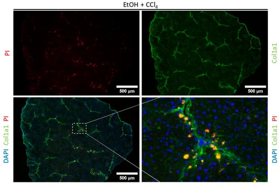 Co-staining of PI with a fluorescence-labeled collagen antibody. Collagen antibody is conjugated to Alexa Fluor 488 (green) and was co-stained with PI (red) and DAPI (blue) in liver cryosections of mice treated with EtOH + CCl4. Collagen1a1 (Col1a1) stained the fibrotic tissue characteristic from these treated mice. Merge image and the augmentation showed the region in the liver tissue where the cells are positive for PI and Col1a1 (yellow). Images were taken at 20× magnification, scale bar = 500 μm.