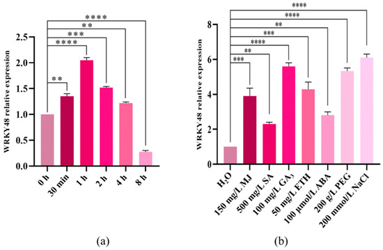 Expression analysis of WRKY48. (a) WRKY48 expression under low temperature; (b) WRKY48 expression under H2O (as a control), MJ (Methyl Jasmonate), SA (Salicylic acid), GA3 (Gibberellin A3), ETH (Ethylene), ABA (Abscisic acid), PEG (Polyethylene glycol), and NaCl. Note: The bar chart represents the mean of three biological replicates, with error bars showing standard deviations. Asterisks indicate statistical significance based on one-way analysis of variance (** p < 0.01, *** p < 0.001, and **** p < 0.0001).