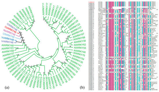 Analysis results of amino acid sequences for CsWRKY48. (a) Phylogenetic tree and (b) sequence analysis. Note: The target protein was marked with a red, ClWRKY48 (Camellia lanceoleosa, KAI8010938.1), NsWRKY48 (Nyssa sinensis, KAA8531200.1), CfWRKY48 (Cornus florida, XP059632820.1), VvWRKY48 (Vitis vinifera, RVW69378.1), and VrWRKY48 (Vitis rotundifolia, KAJ9699830.1).