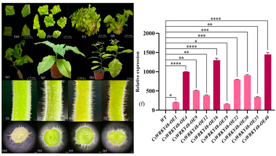 Genetic transformation, positive seedling screening, and phenotypic observation of transgenic tobacco. (a) Tobacco leaf discs infected with Agrobacterium tumefaciens; (b) induction of resistant buds; (c) expansion of resistant buds; (d) isolation of resistant buds; (e) formation of independent lines; (f) expression analysis of transgenic lines; (g) transgenic tobacco after transplanting; (h) seeds harvested from mature transgenic tobacco for subsequent experiments; (i,m) control tobacco plants; (j,n) CsWRKY48-OE4; (k,o) CsWRKY48-OE16; and (l,p) CsWRKY48-OE40. Note: The bar chart represents the mean of three biological replicates, with error bars showing standard deviations. Asterisks indicate statistical significance based on one-way analysis of variance (* p < 0.05, ** p < 0.01, *** p < 0.001, and **** p < 0.0001).
