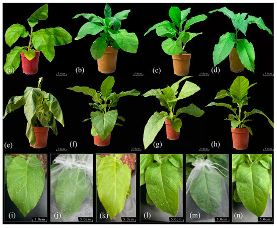 The average height of the transgenic and control tobacco plants was 42.35 cm, the leaf width was 11.27 cm, and the leaf length was 17.61 cm. No significant differences were observed in plant height, leaf length, or leaf width between the transgenic and control tobacco plants. However, the control tobacco plants showed slight wilting and yellowing after 12 h of exposure to low temperatures (Figure 4a), while the transgenic tobacco plants remained upright (Figure 4b–d). After 24 h of low-temperature treatment, the wilting and yellowing of the control tobacco plants increased further (Figure 4e), whereas the transgenic tobacco plants remained upright, except for a slight yellowing of the leaves (Figure 4f–h). There were sagging leaf margins and a pronounced yellowing of the control tobacco leaves after 12 h of aphid feeding (Figure 4i–k). However, there were no obvious differences in the transgenic tobacco after compared to before aphid feeding (Figure 4l–n).