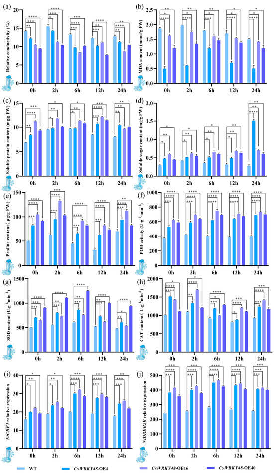 Physiological and biochemical indices and relative expression of two cold resistance genes in transgenic tobacco at 4 °C. (a) Relative conductivity; (b) MDA content; (c) soluble protein content; (d) soluble sugar content; (e) proline content; (f) POD activity; (g) SOD activity; (h) CAT activity; (i) relative expression of NtCBF1; and (j) relative expression of NtDREB2B. Note: The bar chart represents the mean of three biological replicates, with error bars showing standard deviations. Asterisks indicate statistical significance based on one-way analysis of variance (* p < 0.05, ** p < 0.01, *** p < 0.001, and **** p < 0.0001).