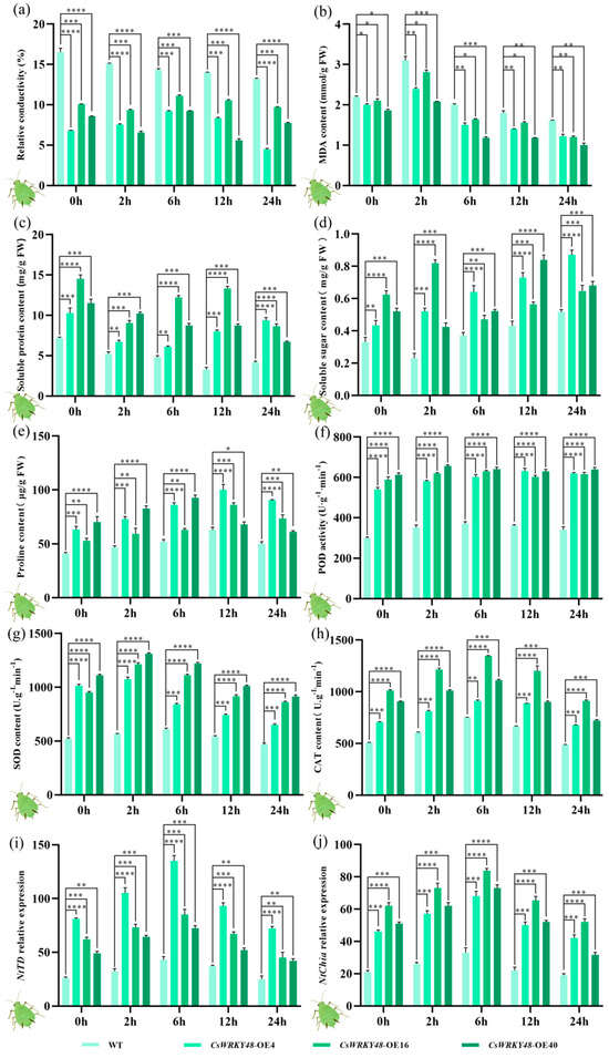 Antioxidant enzyme activities and the expression of two insect resistance genes in the control tobacco plant and the CsWRKY48 transgenic plant after aphid feeding. (a) Relative conductivity; (b) MDA content; (c) soluble protein content; (d) soluble sugar content; (e) proline content; (f) POD activity; (g) SOD activity; (h) CAT activity; (i) relative expression of NtTD; and (j) relative expression of NtChiA. Note: The bar chart represents the mean of three biological replicates, with error bars indicating standard deviations. Asterisks denote statistical significance based on one-way analysis of variance (* p < 0.05, ** p < 0.01, *** p < 0.001, and **** p < 0.0001).