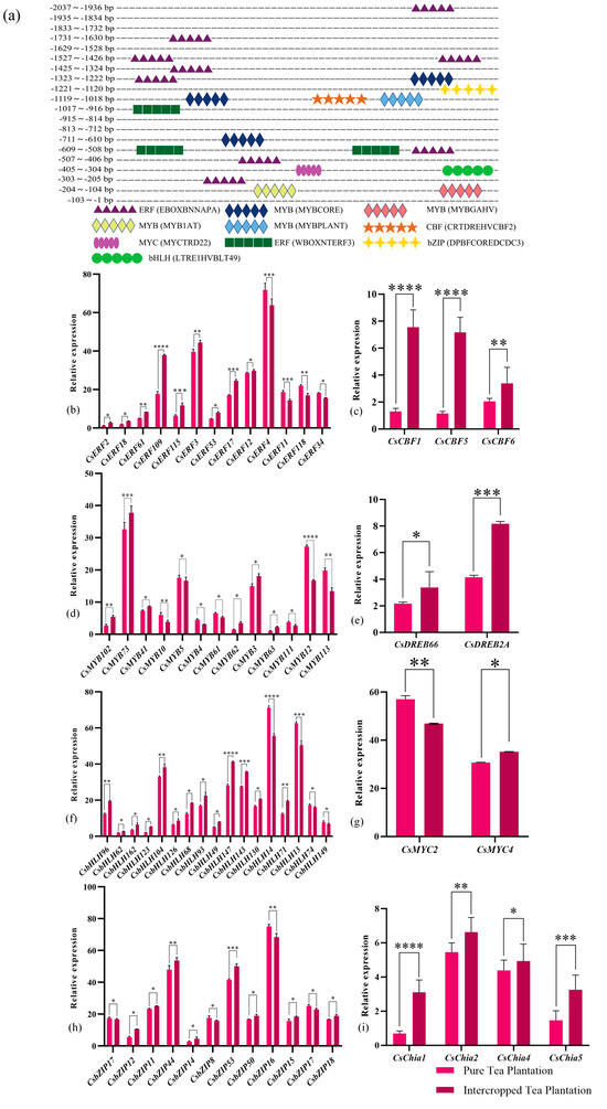Prediction of cis-elements in the promoter of CsWRKY48, and analysis of the expression of relevant transcription factors and resistance genes in the transcriptomic data of the tea plants intercropped with Chinese chestnut. Note: (a) Prediction of cis-element in the promoter of CsWRKY48; analysis of the expression of relevant transcription factors and resistance genes in the transcriptomic data of the tea plants intercropped with Chinese chestnut. (b–i) Analysis of the expression of relevant transcription factors and resistance genes in the transcriptomic data of the tea plants intercropped with Chinese chestnut (* p < 0.05, ** p < 0.01, *** p < 0.001, and **** p < 0.0001).