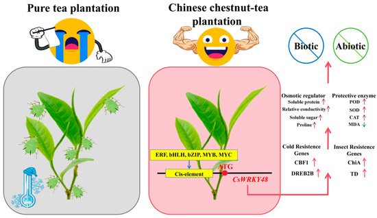 In this study, we demonstrated that CsWRKY48 significantly increased tea plants resistance to biotic and abiotic stresses in Chinese chestnut tea intercropped plantations. In this environment, changes in light exposure and allelopathic interactions may influence the hormonal levels in tea plants, triggering the activation of the CsWRKY48 gene. This activation is mediated by the interaction of the CsWRKY48 promoter with transcription factors such as MYB, MYC, bHLH, and ERF (Figure 8). CsWRKY48 induced the upregulation of cold resistance genes like CsCBF and CsDREB, as well as insect resistance genes like CsChiA, which contributed to the overall plant health in Chinese chestnut tea intercropped plantation. Moreover, CsWRKY48 affected trichome length and density, further improving resistance to cold and insects while increasing the fragrance of tea plants. Future research should focus on revealing how CsWRKY48 interacts with plant growth regulators and transcription factors, such as MYB, MYC, bHLH, and ERF, to boost cold and insect resistance in tea plants. Understanding these interactions will be vital for uncovering the mechanisms that improve plant resilience in Chinese chestnut tea intercropped systems.
