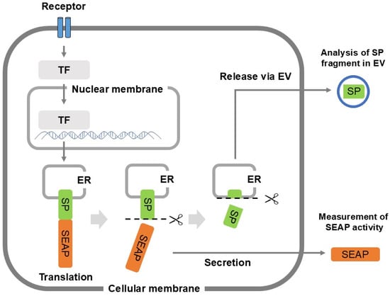Detection of SP fragment using SEAP reporter system. SEAP SP was exchanged for specified SP, and specified SP and SEAP reporter sequences were stably expressed in clonal cells. Based on gene expression, SEAP activity in extracellular fluid was measured for translational activity. In addition, distribution of SP and their fragments in the ER and the EV were examined with a mass spectrometry TF; transcription factor, EV; extracellular vesicle, enzymes such as signal peptidase and signal peptide peptidases indicated as an icon of scissors.