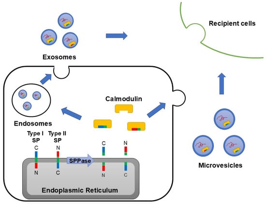 In addition, SEAP SP content in both microvesicles and exosomes decreases in the presence of a calmodulin inhibitor [78], further supporting calmodulin’s role in SP transport to extracellular vesicles. These findings suggest that the cleaved SP fragments on the ER may bind to calmodulin and be transported to exosomes or microvesicles depending on the cell’s activation state (Figure 2). Calmodulin is involved in multiple intracellular signaling pathways, and its role in SP fragment translocation likely varies based on the cell’s signaling state and activation conditions [105,106]. Given the bioactivity of SP fragments, the functional differences between exosomes and microvesicles could be partly explained by differences in their SP fragment content.