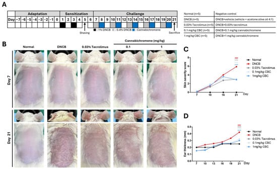 For this investigation, 25 male BALB/C mice were obtained from Japan SLC, Inc. (Shizuoka, Japan). The specimens were six weeks old with a mass range of 16–20 g each. The subjects were divided into five groups, with five mice per group. The animals were maintained in an environment with a 12 h light/dark cycle, at a temperature of 23 °C ± 3 °C and 50% ± 10% humidity. The experimental solution was prepared by combining DNCB (97-00-7, Sigma-Aldrich, Budapest, Hungary) with an acetone/olive oil solution (4:1 ratio) to achieve concentrations of 1% and 0.4%. A 0.03% tacrolimus ointment (Protopic®, LEO Pharma, Ballerup, Denmark) served as the positive control. Cannabichromene was provided by Yuhan Care Co., Ltd. (Seoul, Republic of Korea). The Seoul Regional Food and Drug Administration granted permission to use narcotics. Cannabichromene was similarly diluted in the acetone/olive oil mixture to concentrations of 0.1 mg/kg and 1 mg/kg, mirroring the DNCB preparation. To induce AD in the mouse model, the abdomens of the mice were first shaved using animal clippers. Subsequently, 1% DNCB was applied twice over one week. The dorsal hair of the BALB/C mice was then removed using clippers and hair removal cream. The mice were allowed a 72 h rest period before the experiment proceeded. During the experimental phase, 0.4% DNCB was applied to the shaved dorsal skin. After 24 h, treatments of either the vehicle (acetone/olive oil 4:1), Cannabichromene (0.1 mg/kg or 1 mg/kg in acetone/olive oil 4:1), or 0.03% tacrolimus were administered. This process was repeated five times, with a 24 h stabilization period between treatments. Upon conclusion of the experiment, all mice were euthanized. The animal experimental procedures adhered to the Laboratory Animals Welfare Act, the Guide for the Care and Use of Laboratory Animals, and the Guidelines and Policies for Rodent Experiments. These guidelines were provided by the Institutional Animal Care and Use Committee of the School of Medicine, The Catholic University of Korea (approval no. CUMS-2023-0142-01).