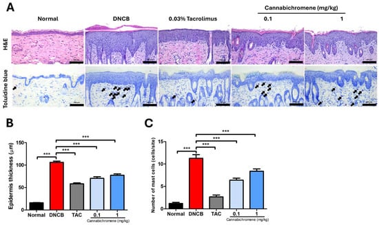 Result of staining after treating cannabichromene on atopic dermatitis mouse model dorsal skin. (A) Representative H&E stain and Toluidine blue stain images from each group (200× magnification, arrows indicate mast cells), (B) results of measuring epidermis thickness after H&E stain (total n = 5/group), (C) results of counting mast cell invasion (total n = 5/group), data shown in the figure are provided as mean ± SEM (*** p < 0.001 vs. normal group or DNCB group). DNCB, 1-chloro-2,4-Dinitrochlorobenzene; TAC, 0.03% tacrolimus; H&E, Hematoxylin and Eosin.