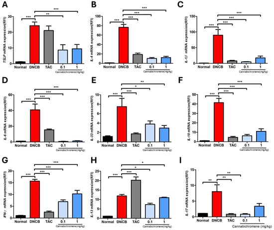 Results of confirming the mRNA expression of various cytokines after treating cannabichromene in an atopic dermatitis mouse model. Various cytokines (A) TSLP, (B) IL-4, (C) IL-1β, (D) IL-6, (E) IL-33, (F) IL-18, (G) IFN-γ, (H) IL-13, (I) IL-17 were identified through qRT-PCR (total n = 5/group). All cytokines were normalized to Actb, and expression levels were analyzed using the ΔΔct method. Data shown in the figure are presented as mean ± SEM (* p < 0.05, ** p < 0.01, *** p < 0.001 vs. normal group or DNCB group). DNCB, 1-chloro-2,4-Dinitrochlorobenzene; TAC, 0.03% tacrolimus.