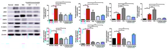 Results of confirming the expression of proteins related to the JAK/STAT pathway after treating cannabichromene in an atopic dermatitis mouse model. Through Western blot, the expression of JAK/STAT family of proteins (total n = 5/group) was confirmed. The membrane band intensity of all proteins was measured using ImageJ software and normalized to β-actin. Data shown in the figure are presented as mean ± SEM (* p < 0.05, ** p < 0.01, *** p < 0.001 vs. normal group or DNCB group). DNCB, 1-chloro-2,4-Dinitrochlorobenzene; TAC, 0.03% tacrolimus.
