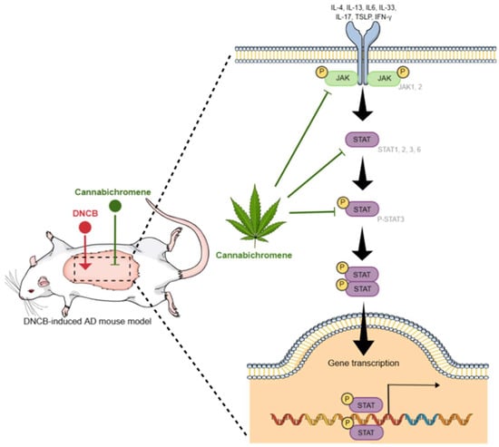 The effect of cannabichromene on a mouse model of hapten-induced contact dermatitis. JAK is activated by cytokine binding to various receptors, and when phosphorylated, STAT protein is activated and phosphorylated. Phosphorylated STAT translocates to the nucleus and activates gene transcription. Cannabichromene has been shown to inhibit these pathways, and, based on these results, it is confirmed to have a therapeutic effect on atopic dermatitis.