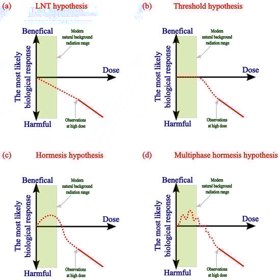 Graphical representation of the main hypotheses used to explain the biological effects of low-dose ionizing radiation. (a) Presented is a graphical diagram illustrating the linear increase in human health risks at any level of ionizing radiation (LNT hypothesis). (b) An illustration of the ionizing radiation threshold hypothesis, which states that negative effects on human health occur only above a certain dose rate and are then subject to linear dependence. (c) An illustration of the theory of radiation hormesis, according to which irradiation at dose loads close to the natural background has positive effects on human health. (d) The multiphase theory of hormesis explains the large scatter of data on biological effects observed by researchers when using similar dose loads, and also the observation of approximately the same biological effects at significantly different dose loads.