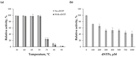 Characterization of 3′→5′ exonuclease activity of the Tt72 DNA polymerase. The enzyme’s activity was assessed by measuring the radioactivity released from labeled λ/HindIII DNA fragments. (a) 3′→5′ exo activity of Tt72 DNA polymerase after 10 min heat treatment at temperatures ranging from 55 °C to 95 °C. (b) Effect of dNTP concentration on the 3′→5′ exo activity of the Tt72 DNA polymerase. Error bars indicate the mean ± standard deviations. Each experiment was conducted in triplicate.