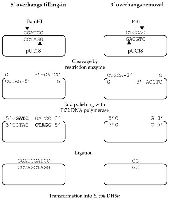 - Yang, S.; Li, X.; Ding, D.; Hou, J.; Jin, Z.; Yu, X.; Bo, T.; Li, W.; Li, M. A Method for Filling in the Cohesive Ends of Double-Stranded DNA Using Pfu DNA Polymerase. Biotechnol. Appl. Biochem. 2005, 42(Pt. 3), 223–226. [Google Scholar] [CrossRef]
