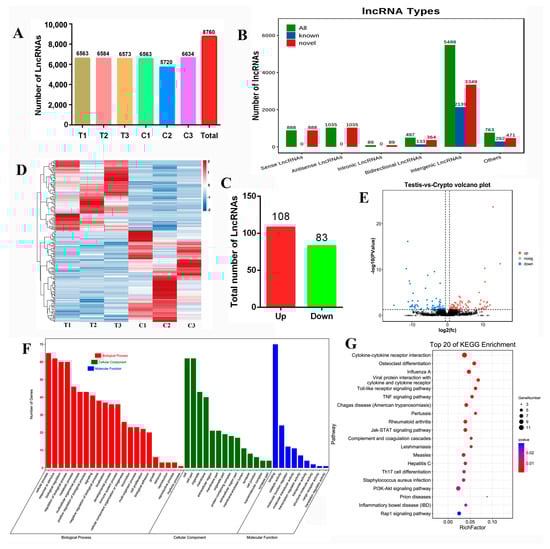 Analysis of differentially expressed LncRNA: (A) LncRNA distribution in the testis group and the cryptorchidism group; (T, testis; C, cryptorchidism); (B) number of LncRNA types; (C) total number of LncRNAs that were differentially expressed in the testis and the cryptorchidism group; the red color represents the number of LncRNAs upregulated in cryptorchidism compared to normal testes, the green color represents the number of LncRNAs decreased. (D) cluster heat map analysis of testis and cryptorchidism; (E) LncRNA differentially expressed volcano map; (F) GO analysis of 191 differentially expressed LncRNAs; (G) KEGG enrichment analysis.