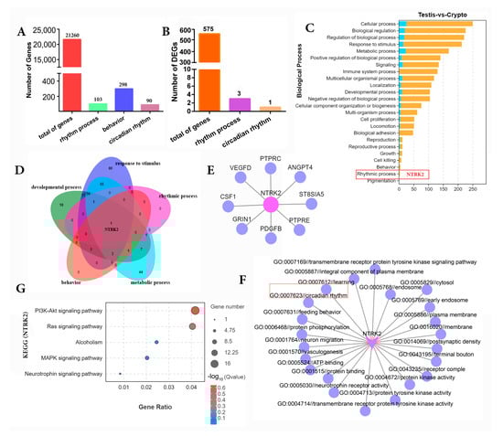 GO and KEGG analysis of differentially expressed genes (circadian rhythms): (A) genes involved in circadian activity were analyzed in testis and cryptorchids; (B) analysis of differentially expressed genes involved in circadian rhythms in testicular and cryptorchidism; (C) biological process analysis of circadian rhythm-related differential genes; (D) screening for circadian rhythm-related differential genes using Veen map; (E) interaction gene analysis of NTRK2; (F) functional analysis of NTRK2 involved in the GO enrichment process; (G) NTRK2 is involved in the enrichment signaling pathway.
