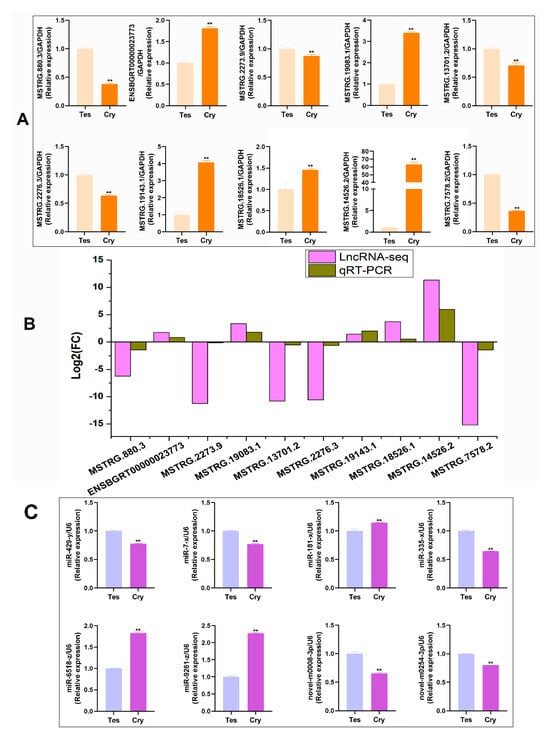 Verification of differentially expressed LncRNAs in the testis and cryptorchids: (A) differentially expressed LncRNAs were detected with qRT-PCR, n = 3, mean ± SD, ** p < 0.01; (B) LncRNA sequencing analysis; (C) differentially expressed miRNAs were detected with qRT-PCR, n = 3, mean ± SD, ** p < 0.01.