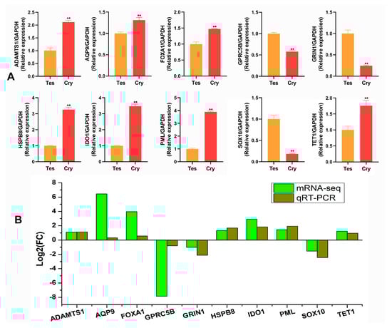 Differential expression of genes was verified in the testis and cryptorchids of the yaks: (A) differentially expressed mRNAs were detected with qRT-PCR, n = 3, mean ± SD, ** p < 0.01; (B) mRNA sequencing analysis.
