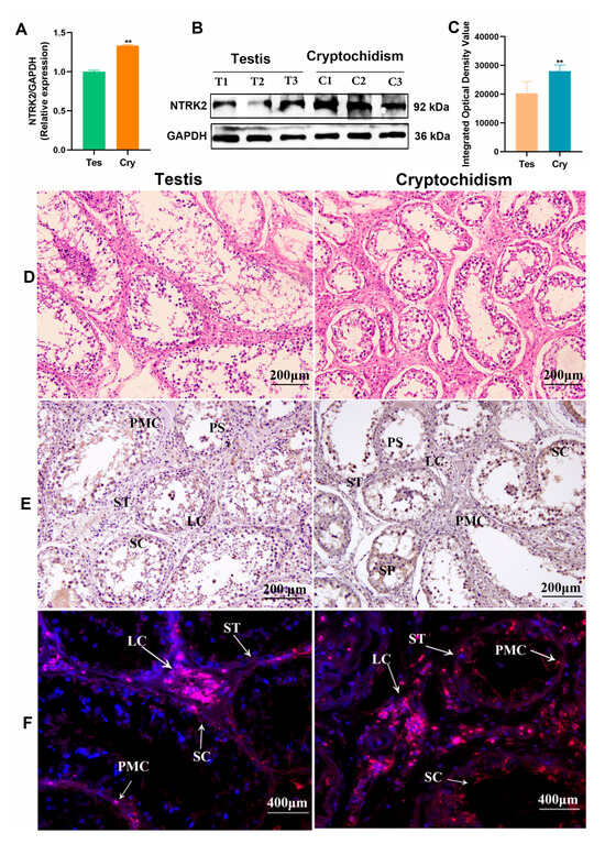 NTRK2 expression pattern analysis in testis and cryptorchids: (A–C) mRNA and protein expression levels of NTRK2 were analyzed using qPCR and Western blot, n = 3, mean ± SD, ** p < 0.01; (D) H&E staining was used to analyze the morphology and structure of testis and cryptorchids; (E,F) protein distribution of NTRK2 was stained by immunohistochemistry and immunofluorescence in testis and cryptorchids. LC: Leydig cells, SC: Sertoli cells, SP: spermatogonium, PS: primary spermatocyte, ST: seminiferous tubule, PMC: peritubular myoid cells.