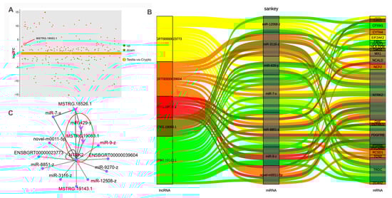 The detailed methods for obtaining the strand-specific cDNA library for LncRNA-seq, miRNA-seq, and mRNA-seq in our previous study []. The cDNA libraries from the two groups were sequenced on the Illumina HiSeqTM 250 and HiSeqTM 4000 platforms by Gene Denovo Biotechnology Co., Ltd. (Guangzhou, China). According to the manufacturer’s instructions, total RNA was extracted from each testis sample using the Trlquick Reagent (R1100, Solarbio, Beijing, China). The quality and concentration of the RNA were evaluated on a NanoDrop spectrophotometer (Thermo Fisher, Waltham, MA, USA), an Agilent 2100 Bioanalyzer (Agilent Technologies, Santa Clara, CA, USA), and RNase-free agarose gel electrophoresis. All samples had an RNA integrity number (RIN) > 7.5. Fragments per kilobase of exon per million mapped fragments (FPKM) were calculated to determine the miRNA, LncRNA, and mRNA expression levels using StringTie v2.2.0. To identify differentially expressed transcripts across samples or groups, the edgeR package (version 4.4, http://www.bioconductor.org/packages/release/bioc/html/edgeR.html, accessed on 13 April 2024) was used. We identified mRNA, miRNA, and LncRNA with a fold change ≥1 and a false discovery rate (FDR) < 0.05 in a comparison as significant DEGs. To assess functional enrichment, Gene Ontology (GO) Biological Processes term and Kyoto Encyclopedia of Genes and Genomes (KEGG) pathway analyses of mRNAs in the ceRNA network were performed using Cytoscape (version 3.7.1, http://www.geneontology.org/, accessed on 13 April 2024). KEGG is the major public pathway-related database (http://www.kegg.jp/kegg/, accessed on 13 April 2024).