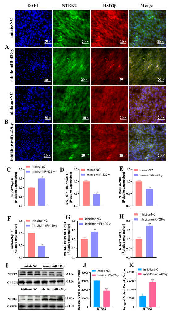 Validation of the targeting relationship between miR-429-y and LncRNA-MSTRG.19083.1 and NTRK2. (A,B) Localization of NTRK2 protein after transfection with mimic-miR-429-y/inhibitor-miR-429-y in LCs was analyzed by immunofluorescence staining. NTRK2 was colored green, HSD3β is shown in red, and nuclei were counterstained with DAPI (blue); magnification, 20×. (C–F) mRNA expression of miR-429-y after transfection of 100 nM mimic/inhibitor into LCs for 48 h. Values represent mean ± SD; n = 3. ** p < 0.01. (D,E,G,H) the mRNA expression of LncRNA-MSTRG.19083.1 and NTRK2 after transfection of 100 nM mimic/inhibitor into LCs for 48 h. ** p < 0.01. (I–K) Protein expression of NTRK2 was assessed by Western blotting after transfection of 100 nM mimic/inhibitor into LCs for 48 h (n = 3). ** p < 0.01.