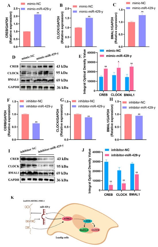LncRNA-MSTRG.19083.1/miR-429-y targets NTRK2 to mediate the cAMP signaling pathway to regulate circadian rhythm: (A–E) mRNA and protein expression of CREB, CLOCK, and BAML1 after transfection of 100 nM mimic into LCs for 48 h, * p < 0.05, ** p < 0.01; (F–J) mRNA and protein expression of CREB, CLOCK, and BAML1 after transfection of 100 nM inhibitor into LCs for 48 h, ** p < 0.01; (K) process model diagram of regulatory mechanism.