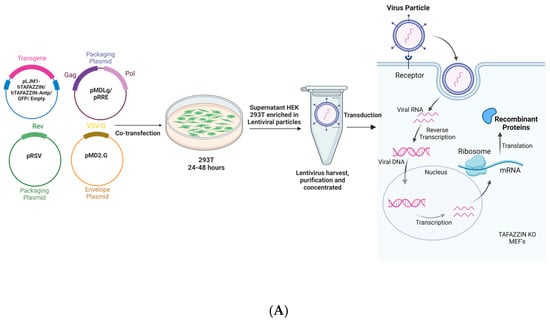 We generated third-generation lentiviral constructs based on pLJM1-EGFP (Addgene, Watertown, MA, USA, cat. #19319) without an insert (Empty Virus), expressing green fluorescent protein (GFP), expressing recombinant human tafazzin (hTAFAZZIN), or expressing recombinant human tafazzin modified to contain penetratin by standard cloning methods. The V2 isoform of TAFAZZIN, lacking exon 5 but retaining enzymatic activity, was used for these studies. All clones were confirmed by sequencing. Lentiviruses were packaged in 293T cells by cotransfection of the pLJM-1 construct with the helper plasmids pRSV-REV (Addgene, Watertown, MA, USA, cat. #12253) and pMDLg/pRRE (Addgene, Watertown, MA, USA, cat. #12251, encoding GAG and POL) as lentiviral packaging vectors, as well as pMD2.G (Addgene, Watertown, MA, USA, cat. #12259) as the VSV-G envelope-expressing plasmid. Packaged lentivirus was concentrated using a Lenti-X Concentrator kit (Takara Bio USA, San Jose, CA, USA, cat. #631231) and titered using a p24 ELISA kit as previously described [11,12].