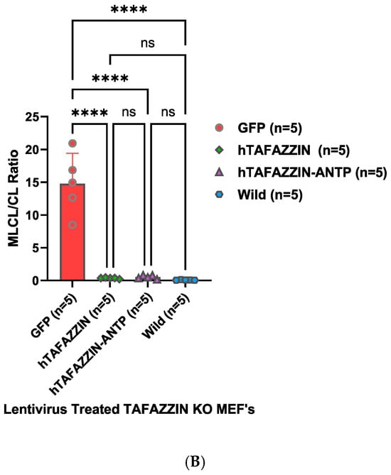 Mouse embryonic fibroblasts were isolated from E13.5 TAFAZZIN KO mice as previously described [13]. One million TAFAZZIN KO MEF cells were infected with 108 transducing units of each lentivirus (native hTAFAZZIN, hTAFAZZIN-Antp, and control GFP) and cultured for one week. Lipids were extracted from the infected MEF cell pellets and assessed for the mature and immature forms of cardiolipin by mass spectrometry as described [14,15]. Briefly, the infected MEF cells were trypsinized, collected by centrifugation and washed twice with PBS (Phosphate buffer saline, pH 7.4). MEF cells were resuspended in 80 µL of PBS, and 40 µL of the cell suspension was spotted onto a Whatman 903 protein saver card. Spots were also spotted with 5 µL of 100 µg/mL solution of Cardiolipin (CL (14:0)4 = CL (56:0); Avanti Polar Lipids, Alabaster, AL, USA), which served as an internal standard and air dried. Dried spots were excised, transferred to 2 mL tubes, and then extracted with 1 mL chloroform/methanol solution (1:1, v/v). Each extracted sample was vortexed and incubated for 15 min at room temperature in a sonicator bath. The filter paper was removed, and the extract was evaporated to dryness with nitrogen at 60 °C. The residue was reconstituted in 100 µL of acetonitrile/isopropanol/water solution (4.5:4.5:1, v/v), was transferred to a sample vial, and then capped. A total volume of 10 μL of lipid extract was injected, and chromatographic separation was achieved on the Agilent 1290 Infinity II UHPLC equipped with ZORBAX Eclipse Plus C18 2.1 × 50 mm, 1.8 µm particle column (Agilent, Santa Clara, CA, USA) at 55 °C. Samples were eluted on a gradient between solvent A (acetonitrile/water [60:40], 10 mM ammonium formate, 0.1% formic acid) and solvent B (isopropanol/acetonitrile [90:10], 10 mM ammonium formate, 0.1% formic acid) at 0.5 mL/min as follows: 0–1 min, solvent B 32%; 1–2 min, solvent B was increased to 70%; 2–8 min, solvent B increased to 80%; 8–9 min, increased to 97% and held at 97% until 13 min. Mass spectrometry was carried out on a 6495 Triple Quad LC-MS (Agilent) in the negative ion electrospray ionization (ESI) mode using MS1scanning, monitoring the different ions or species of MLCL and CL to calculate the MLCL/CL ratio.