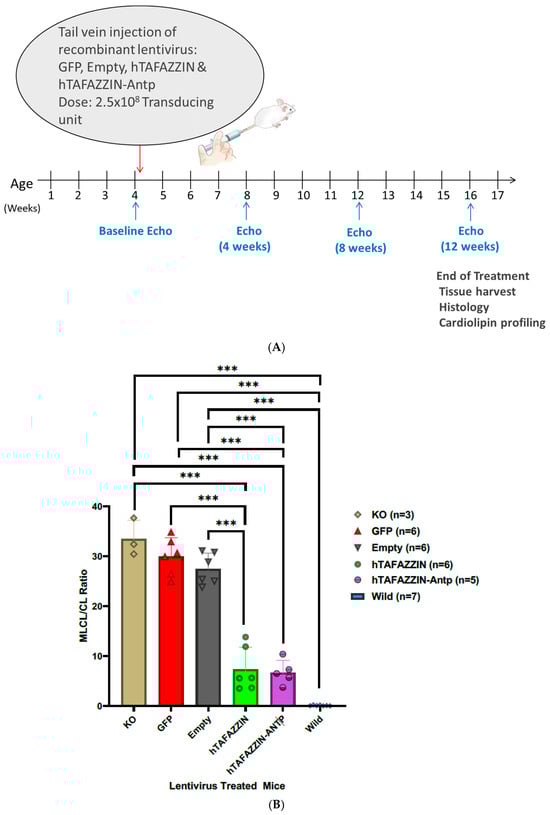 All animal procedures were performed in accordance with the guidelines of the Institutional Animal Care and Use Committee of Tufts Medical Center. A total of 33 male mice were used in the study, and the TAZ KO mice were treated systemically with a single dose of lentivirus (~2.5 × 108 transducing units) via tail vein injection at 4 weeks of age. The viruses used encoded hTAFAZZIN, hTAFAZZIN-Antp, GFP, and empty virus. Serial echocardiograms (ECHOs) were performed every 4 weeks until 16 weeks, and then the mice were euthanized for tissue harvest and downstream analysis. The hearts were harvested for immunohistochemistry and an assessment of the MLCL/CL ratio as described in Section 3.4 and Section 3.5.