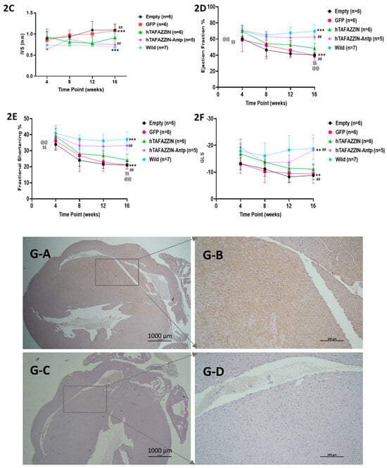 Tafazzin lentiviral gene therapy affects MLCL/CL ratio, cardiac hypertrophy, and cardiac function. (A) Schematic illustration of methodology adopted for TAFAZZIN KO mice lentivirus treatment: Baseline echocardiograms (ECHOs) were performed on TAFAZZIN KO mice prior to systemic treatment with a single dose of lentivirus (~2.5 × 108 transducing units) via tail vein injection at 4 weeks of age (hTAFAZZIN, hTAFAZZIN-Antp, GFP, and empty virus). Serial ECHOs were performed every 4 weeks until 16 weeks. After that, mice were euthanized for tissue harvest and downstream analysis. (B) MLCL/CL ratio in mouse hearts. There is no significant difference between the KO, empty, and GFP-treated mice but a significant difference was found when we compared the KO/GFP/empty-treated mice with the Wild/hTAFAZZIN-Antp/hTAFAZZIN-treated mice (C) Interventricular septum thickness. (D) Left ventricular ejection fraction. (E) Left ventricular fractional shortening. (F) Left ventricular global longitudinal strain. Statistical analysis was performed using IBM SPSS-29 software. One-way ANOVA was conducted between the groups, followed by Bonferonni correction for multiple comparison testing. Within the groups, multiple comparisons were carried out by repeated measures ANOVA with correction by the Bonferroni method. The results are considered significant when the corrected probability level is <0.05 (**/##/@@/$$ p < 0.01, *** p < 0.001). *** Indicates the significant difference between the wild type and the empty/GFP-treated mice. ## indicates the significant difference between hTAFAZZIN-Antp and empty/GFP-treated mice. In (C,D), @@/$$ indicates the significant difference between the time points within each group (empty or GFP). (G) Photomicrograph A,B show the GFP immuno-positive cells in the heart section of GFP lentivirus-treated TAFAZZIN KO mouse at 20× and 100× total magnification. Photomicrograph C,D show the negative control (no primary antibody) for GFP at 20× and 100× total magnification.