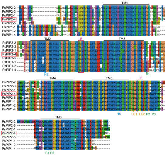 Conserved TM domains and amino acid residues (NPA motifs, ar/R filters, and FPs) of PsPIP2-4. TM1, TM2, TM3, TM4, TM5, and TM6 represent the TM domains. LB and LE represent the NPA motifs. H2, H5, LE1, and LE2 represent the ar/R filters. P1, P2, P3, P4, and P5 represent the FPs. Amino acid residues with the some color represent the high conserved amino acids. PsPIP2-4 is marked with the red box.