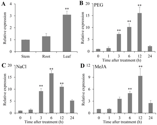 Expression profiles of PsPIP2-4 under 15% PEG, 200 mM NaCl, and 100 µM MeJA treatments in vegetable pea seedlings. Expression patterns of PsPIP2-4 in leaves, roots, and stems (A). Expression profiles of PsPIP2-4 under 15% PEG (B), 200 mM NaCl (C), and 100 µM MeJA (D) stresses in the whole vegetable pea plants. Furthermore, 0, 1, 3, 6, 12, and 24 h represent the treatment times. ** represents means of six replicates (n = 6) that are significantly different at the p < 0.01 level (t-test).